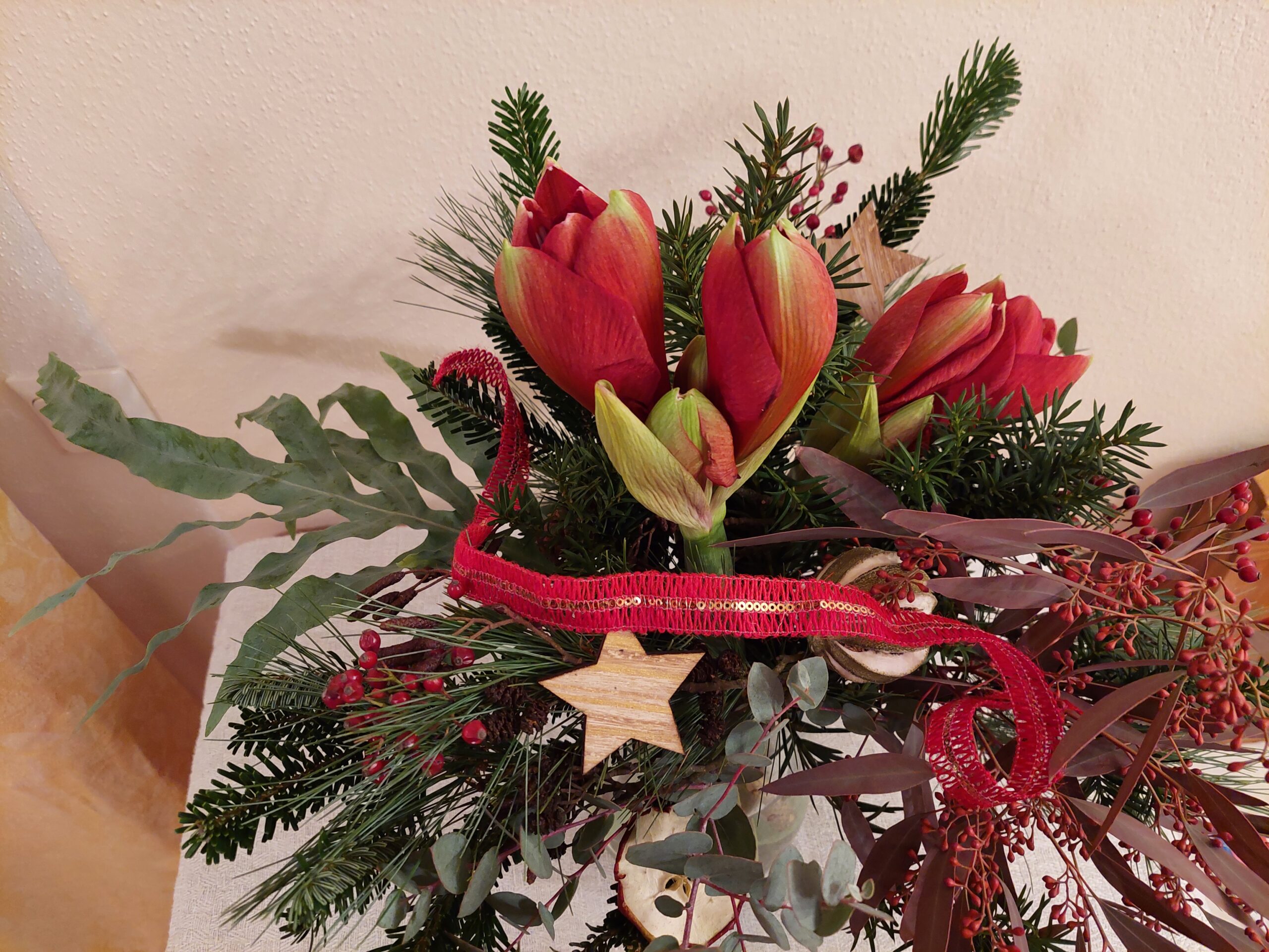 Weihnachtlicher Blumenstrauß mit Amaryllis in rot oder weiß, klein oder groß (Foto großer Strauß)
